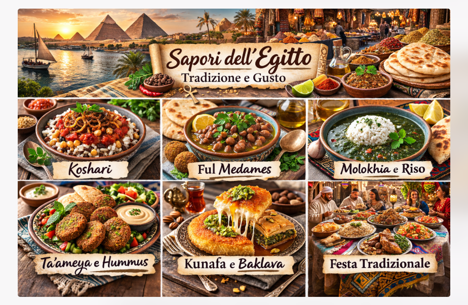 Passeggiando nei mercati del Cairo o di Alessandria si respirano profumi di cumino, coriandolo, cardamomo, sesamo, datteri e pane appena sfornato. Si avverte la cura che ogni famiglia dedica alla preparazione dei piatti tradizionali. Dallo street food alle tavole delle feste religiose, la cucina egiziana offre un’esperienza ricca di sapori, colori e cultura. Ogni piatto racchiude una storia viva, plasmata da influenze faraoniche, arabe, ottomane e mediterranee. Ingredienti, aromi e colori raccontano un passato antico quanto le piramidi. La cucina egiziana è un patrimonio culturale dove tradizione e convivialità si incontrano. I sapori intensi e armoniosi riflettono la fertilità della valle del Nilo e l’incontro tra Africa e Medio Oriente. Assaporare queste specialità significa compiere un viaggio tra storia, geografia e identità, scoprendo ciò che rende unica la gastronomia egiziana.